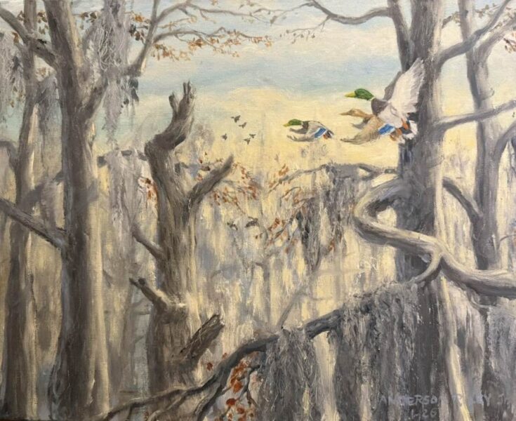 Anderson Riley Anderson Riley - Cruising in the Hood (Hooded Mergansers) 16x20 Oil Anderson Riley - Treetop Leavers 16x20 Oil on Canvas 2026 Anderson Riley - Oyster Tide 2025 Oil on Canvas 36x48x1.5 Anderson Riley - Fog Bank, Greenwing Teal 36x24 Anderson Riley - Sky Dancing, Mississippi Kites Over Columbia Canal 24x12 Anderson Riley - Partly Cloudy With a Chance of Egrets 48x36 Anderson Riley - Rapid Waiting 40x30 Anderson Riley - Tribis 20x16